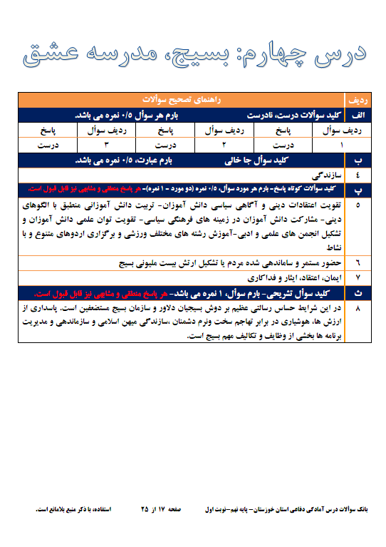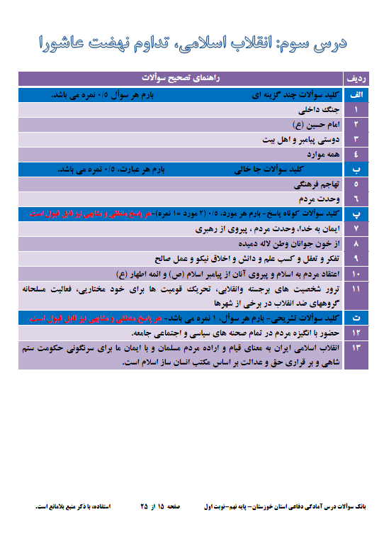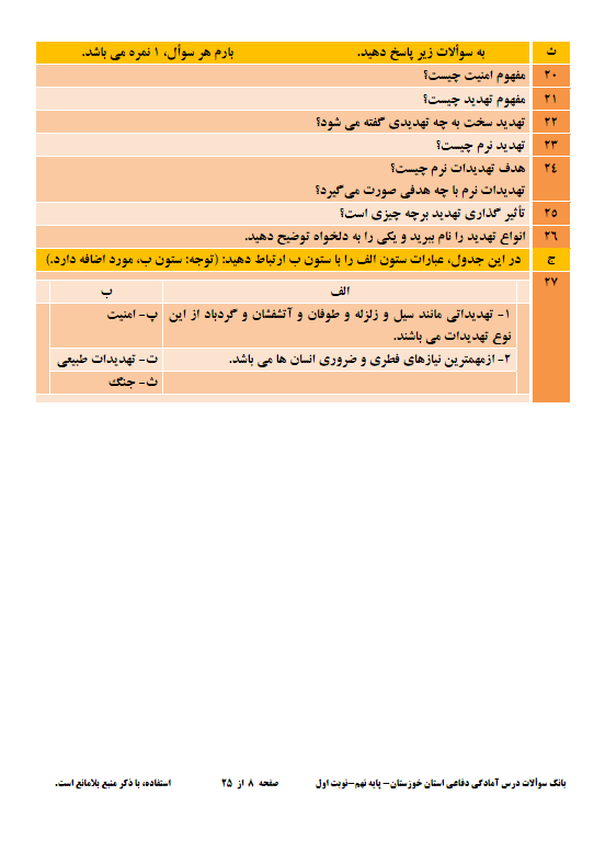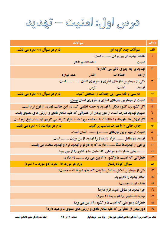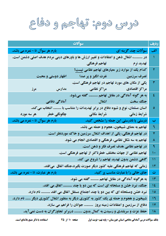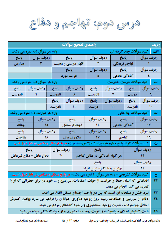 نمونه سوالات امتحاني آمادگي دفاعي پايه نهم 1